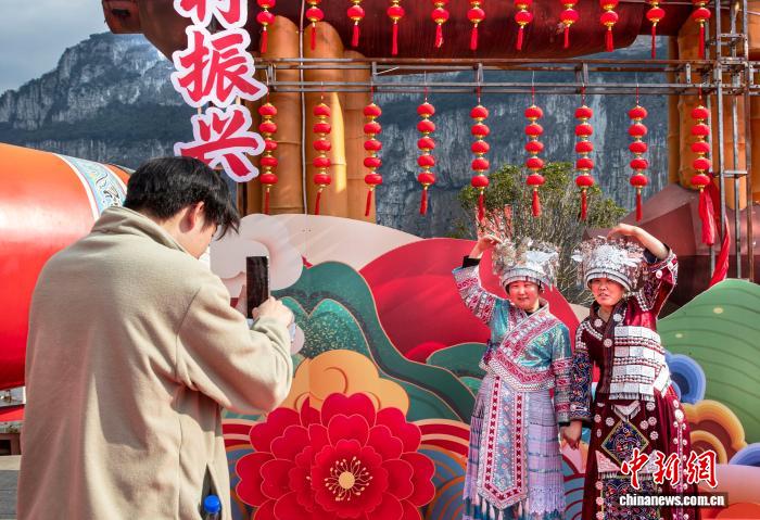 图为乘客身脱苗族衣饰正在化屋村开影摄影。史欢快 摄