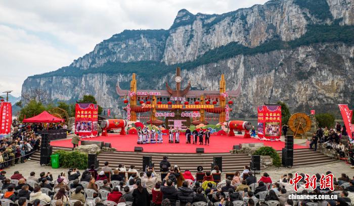 图为村平易近战旅客正在旁观节目上演。(无人机像片)史欢快 摄